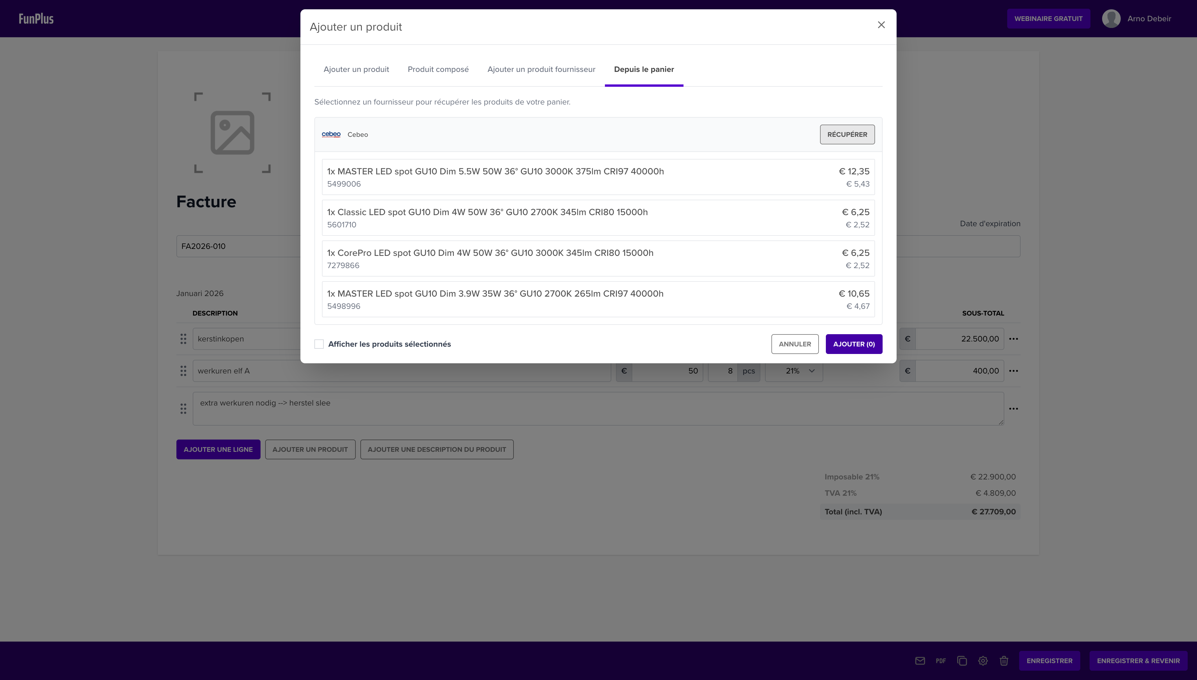 - Vous placez des produits dans le panier en ligne de votre fournisseur (par ex. via la boutique web Cebeo)