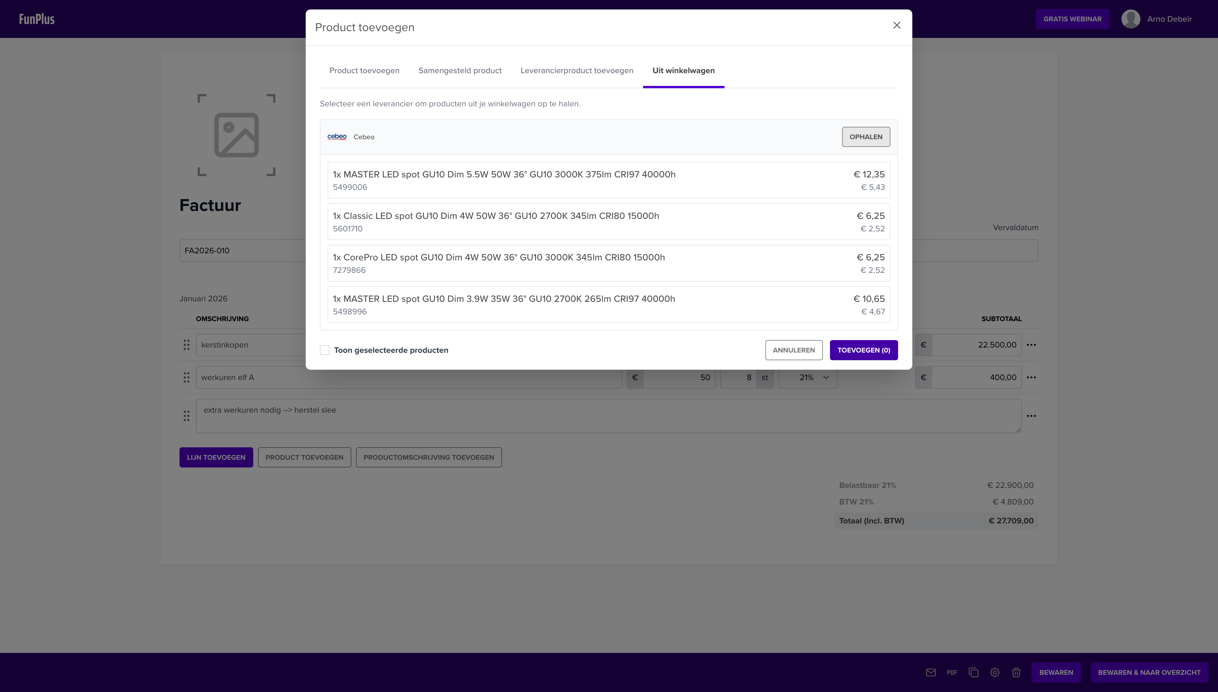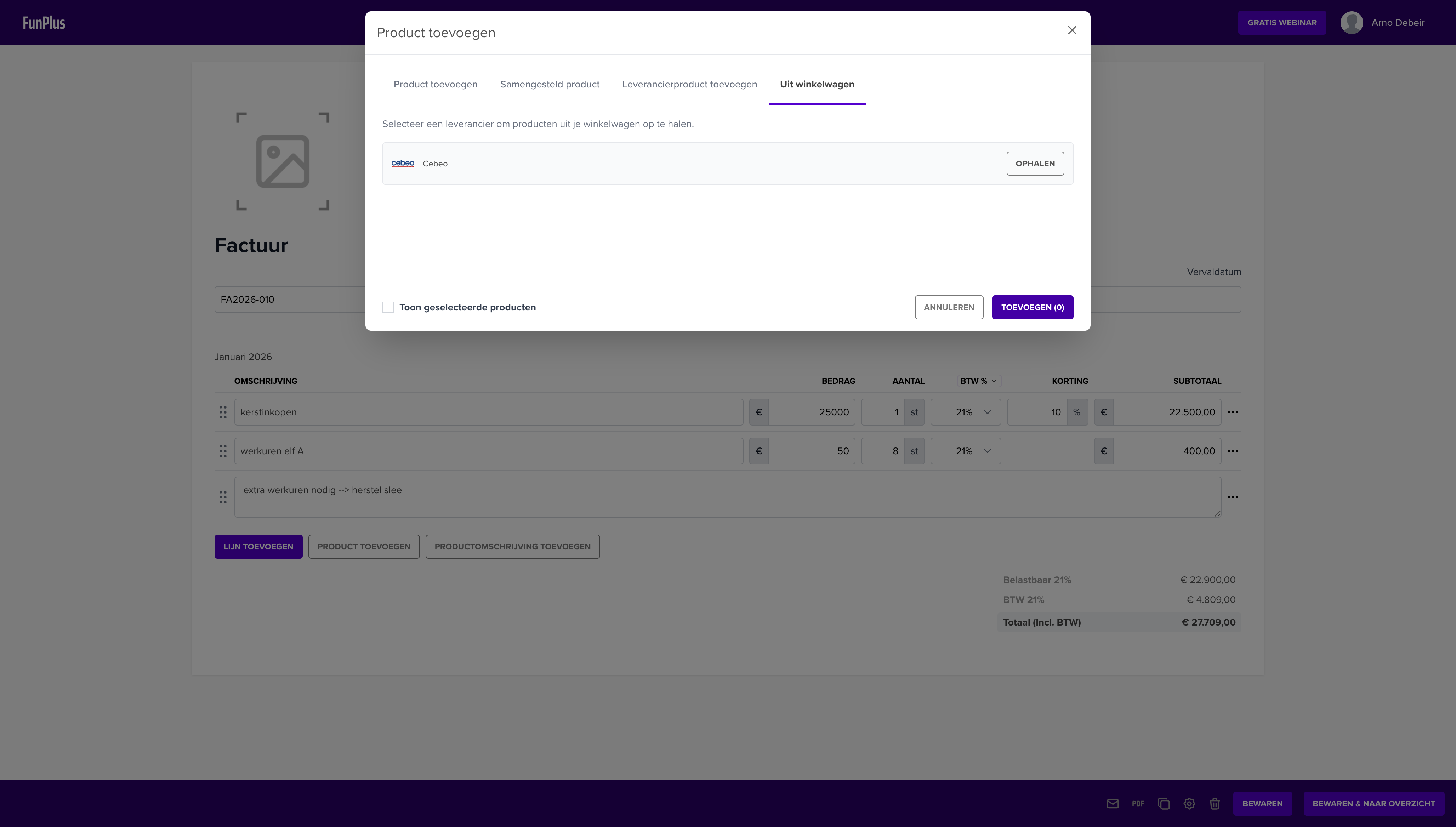 Met de winkelwagen-functie kun je producten rechtstreeks uit de online winkelwagen van je leverancier ophalen en toevoegen aan je facturen. Zo hoef je producten niet meer handmatig over te typen - je haalt ze direct op met alle productgegevens, prijzen en hoeveelheden.